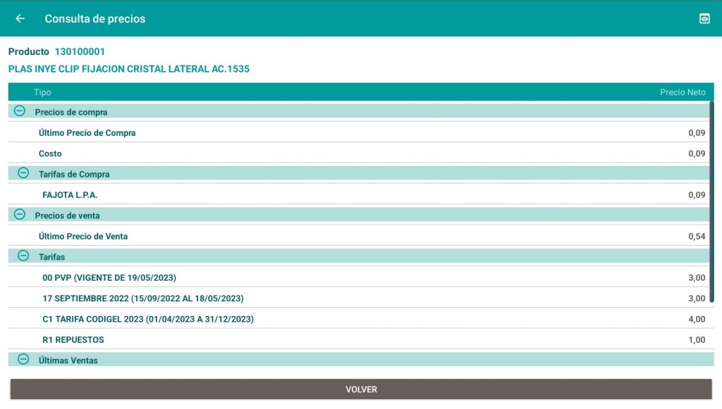 • Últimas ventas: Permite consultar a qué clientes se les ha vendido recientemente este producto y a qué precio.