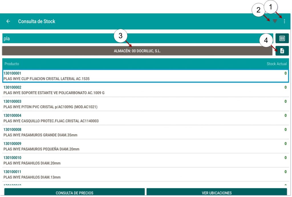 3. Selección de almacén: Facilita la consulta del stock en un almacén específico (no se muestra el stock de todos los almacenes simultáneamente).
