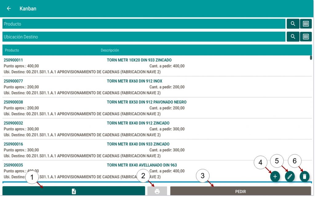 3. Pedir → Redirige a una pantalla donde se puede realizar el pedido de la cantidad establecida en el Kanban, con la posibilidad de modificar dicha cantidad.