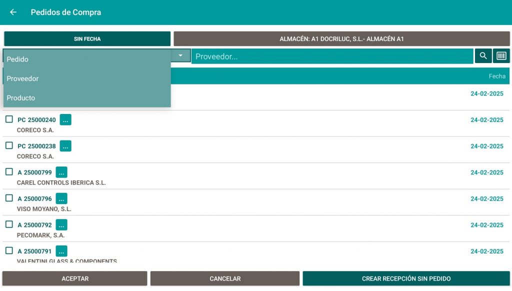 En la parte superior de la nueva pantalla, por defecto, no se establece ninguna fecha, lo que significa que se mostrarán todos los pedidos pendientes de recepción. Si es necesario, se puede aplicar un filtro de fecha para visualizar solo los pedidos de un día específico.