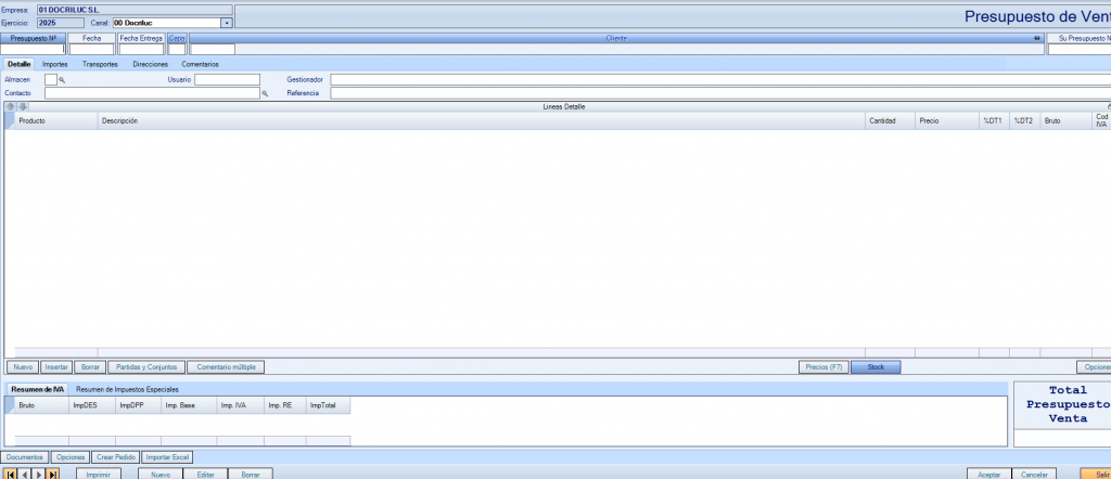 • Nuevo / Insertar / Borrar: Para gestionar líneas de producto dentro del presupuesto.